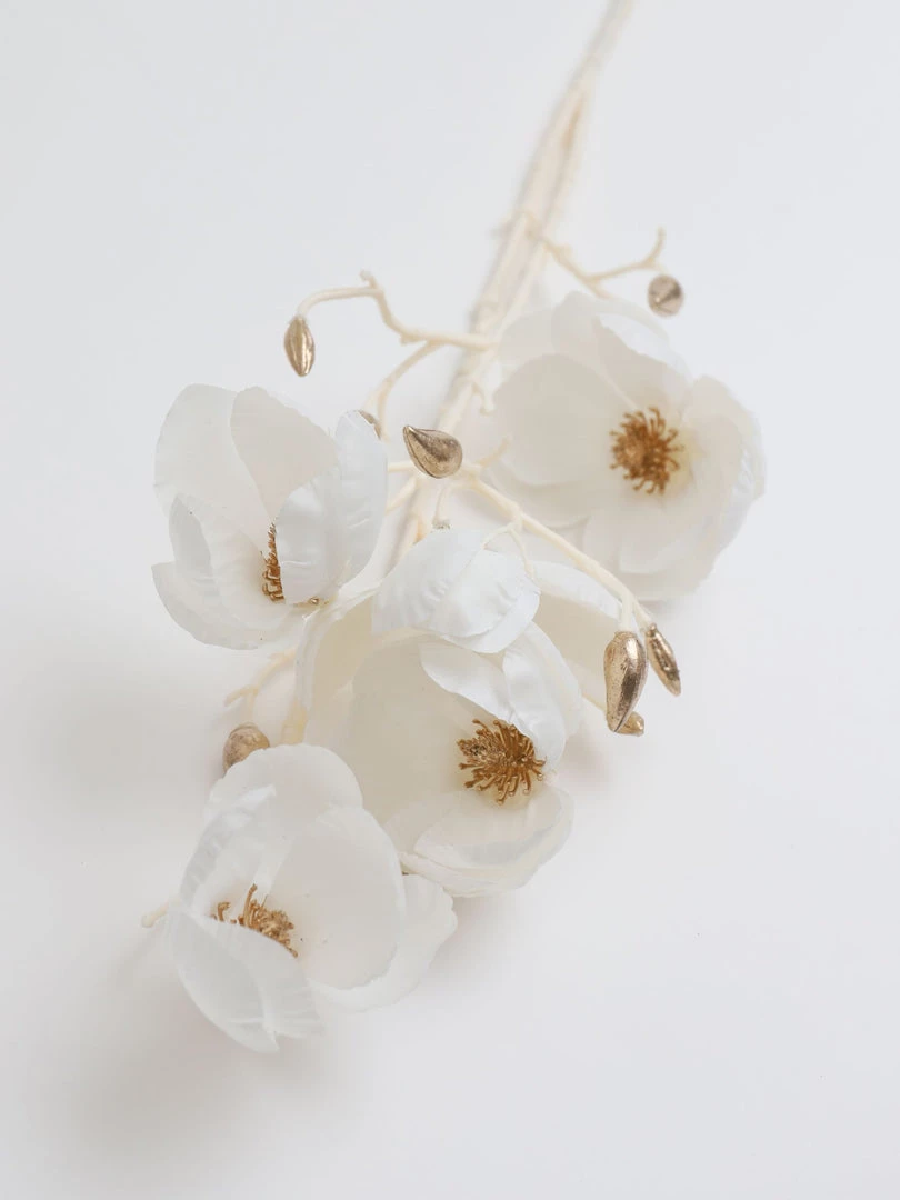 Description: This stunning white and gold stem resembles a beautiful porcelain magnolia flower. It is the perfect stem to use during the winter months, but can be styled year round!