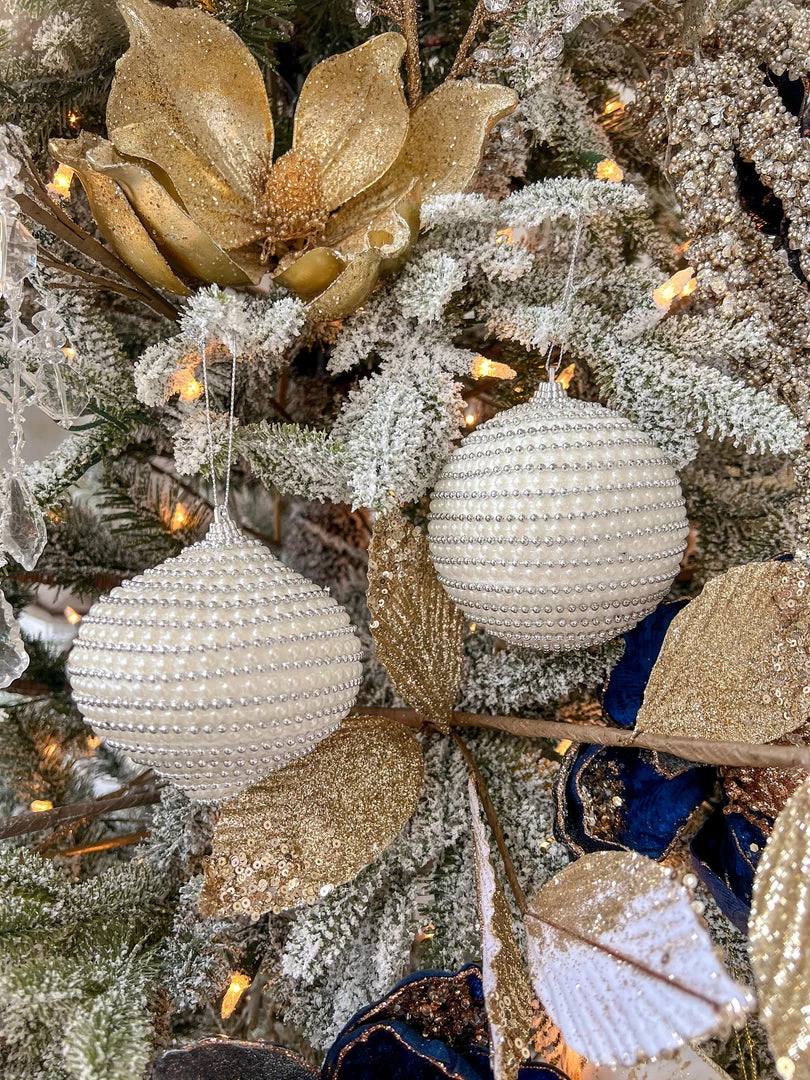 Description: The absolutely gorgeous white textured with silver beads in two different sizes make a stunning displayed on a tray or on your tree.