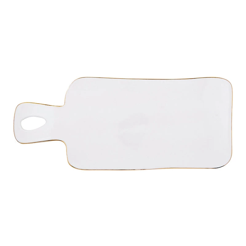 Enjoy simple style with this ceramic serving tray! A bright white base in contrasted by the slight gold trim. A fun and stylist way to serve your favorite snacks!