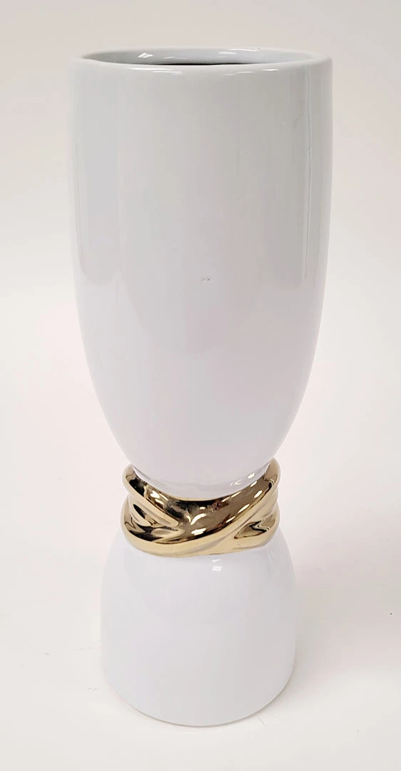 Description: This white and gold vase has a beautiful and unique style! You can style it on its own or on top of a tray with your favorite faux floral. The tall vase has a beautiful cascading gold design and the short has an elegant detailed golden braid design. These match well with the white bowl with elegant gold design.