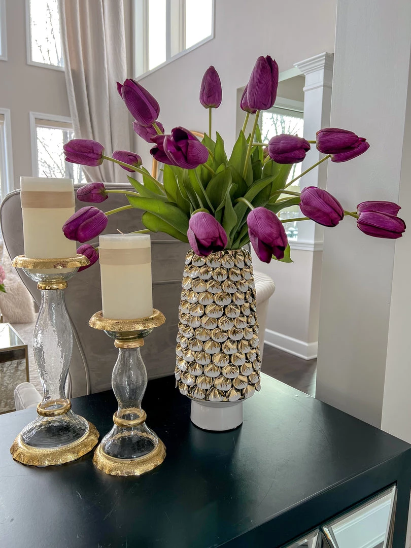 Description: What a statement piece this vase is with its gorgeous gold and white petal design! This is a substantial piece on its own but will make a stunning display filled with your favorite faux floral!