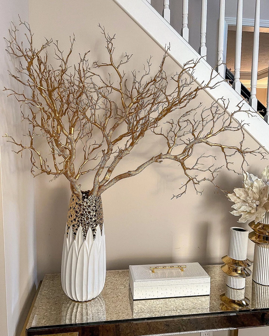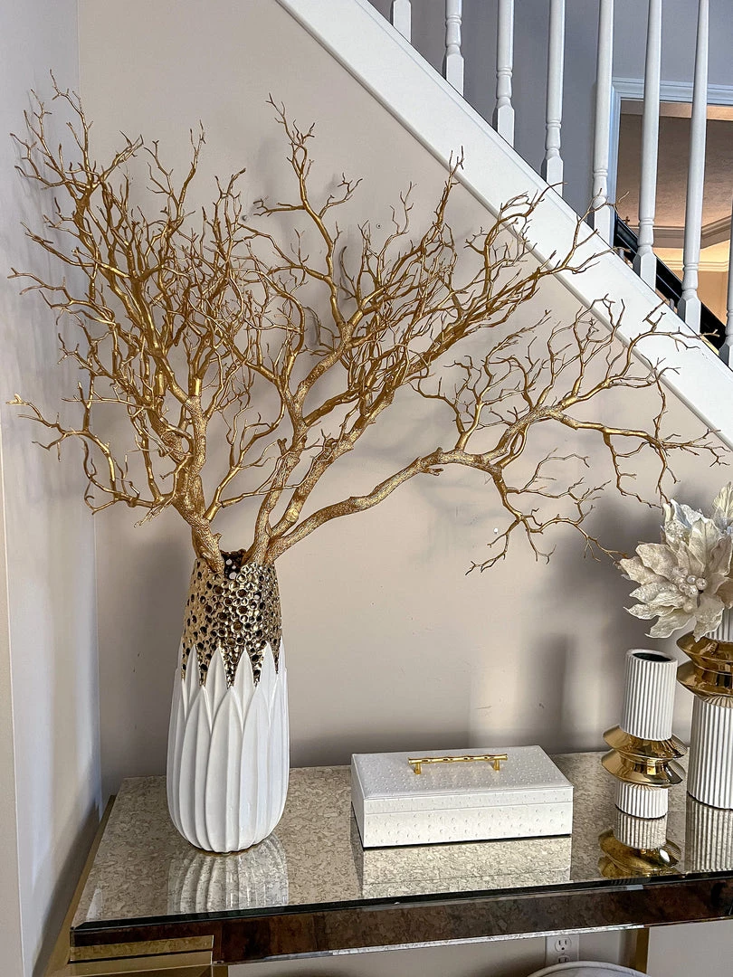 Description: This stunning white ostrich-textured faux leather lidded box is finished with a sleek gold bamboo shaped handle is the perfect place to store your remote controls. The black flannel lining is perfect to store your favorite jewelry or mementos as well.