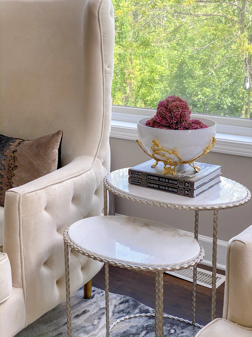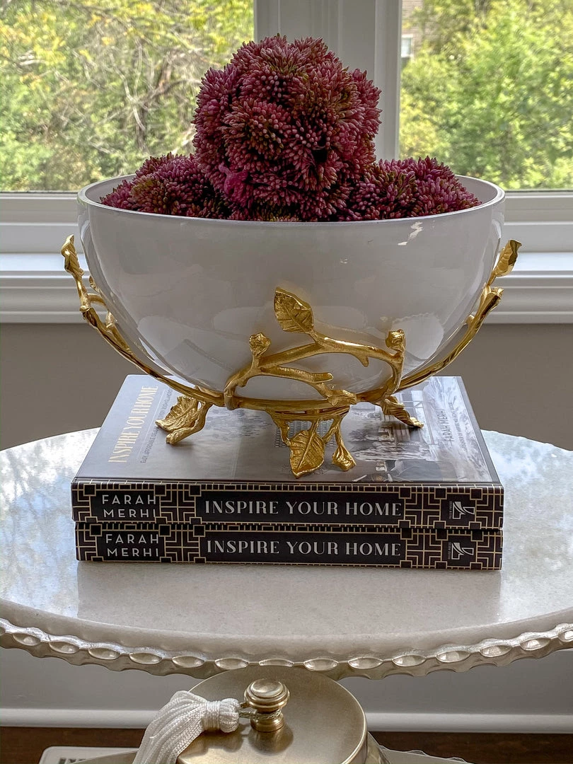 This white glass bowl with a gold leaf-shaped metal base is a great statement decor piece on its own or with other decor placed inside of it.