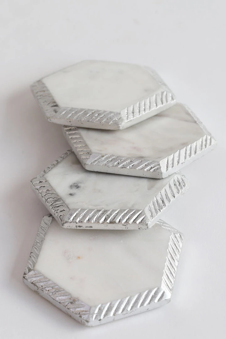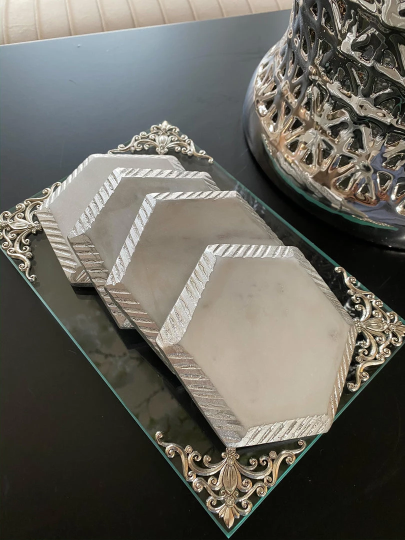 Description: These beautiful white marble hexagon coasters are a perfect accent for your coffee table! Complete with a hammered texture edge and a metallic finish!