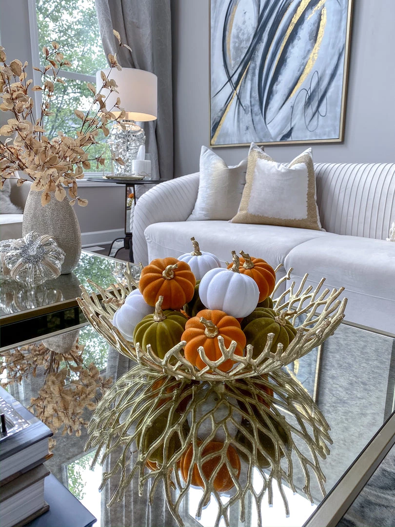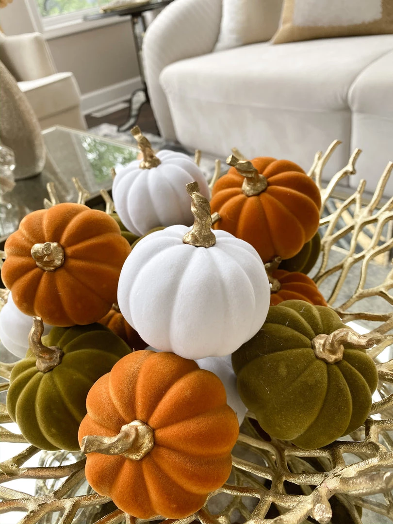 Description: This small, white velvet pumpkin adds a pop of glamour to your fall decor! We love the gold stem!