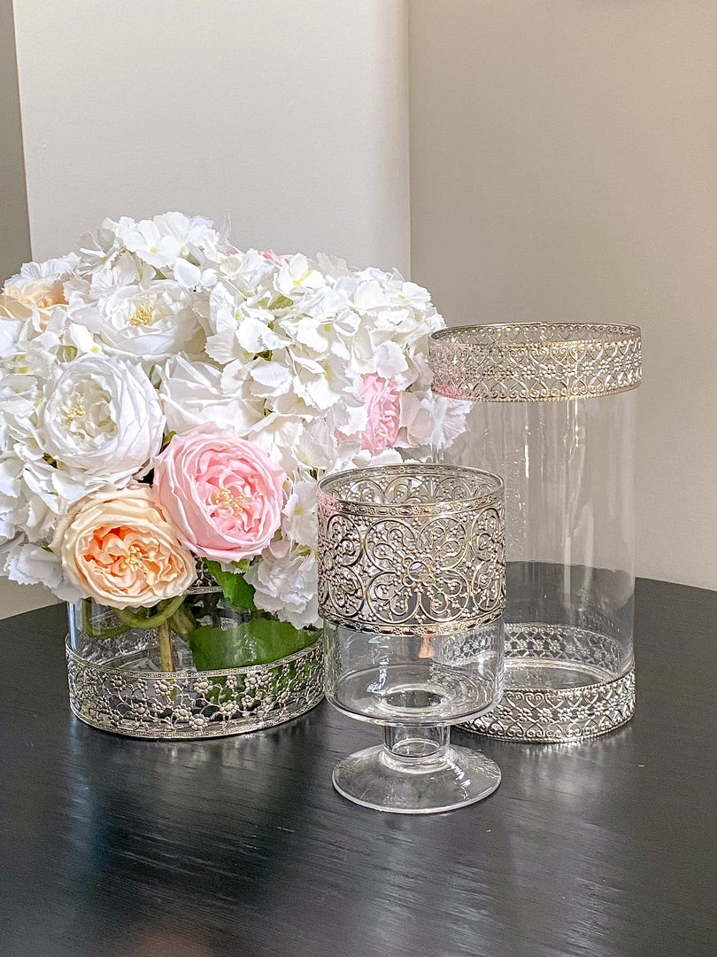 Description: This beautiful glass wide vase features a stunning detail. An ornate silver metal rim accents the piece and elevates the entire design.