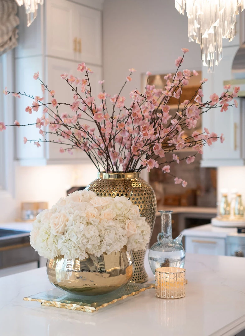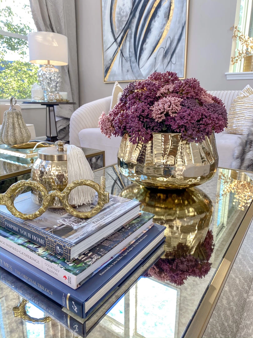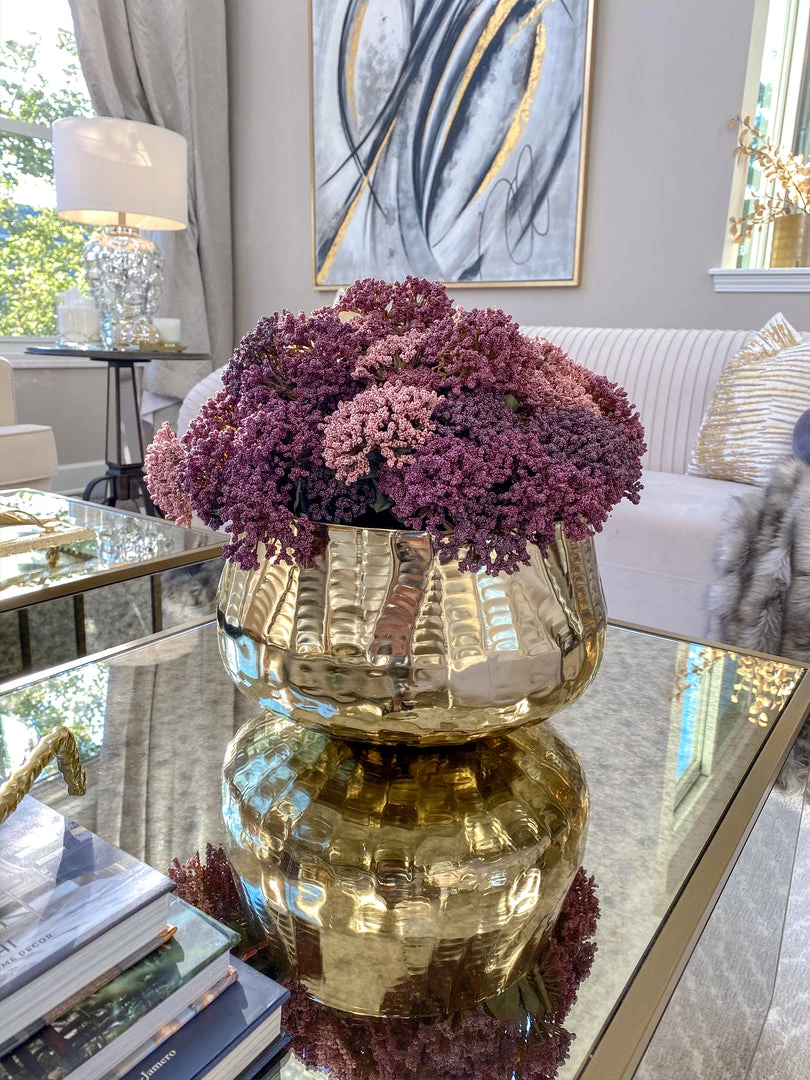 Description: This gold statement bowl is the perfect size to hold your faux floral arrangement.